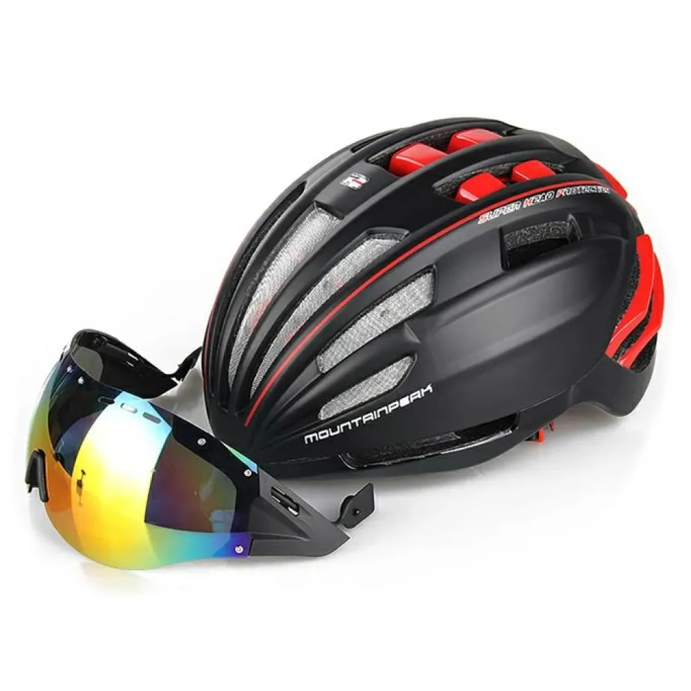 Шлем велосипедный MountainPeak RACE X – крутой и модный с вентиляционными отверстиями считается лучшим предложением этого года. Дизайн привлекает внимание, делает аксессуар заметным в сравнении с другими моделями. Наличие в комплектации съёмный зеркальных очков подчеркивает особые требования райдера к аксессуарам. Покупка шлема гарантирует стопроцентную безопасность головы и защиту райдера от попадания пыли при продолжительной езде. Купить шлем по лучшей стоимости воспользоваться бесплатной поддержкой и другими приятными бонусами производителя предлагает наш интернет-магазин.
