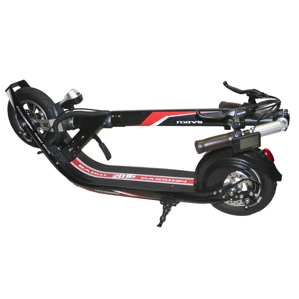 Самокат Baiku Passion в черном цвете имеет эффектный внешний вид, надежный и качественный транспорт стал достаточно популярным среди пользователей. Он имеет складную конструкцию, в сложенном состоянии занимает не много места, при транспортировке свободно поместится в багажник автомобиля. Его масса 18 кг, максимальная нагрузка не должна превышать 120 кг.