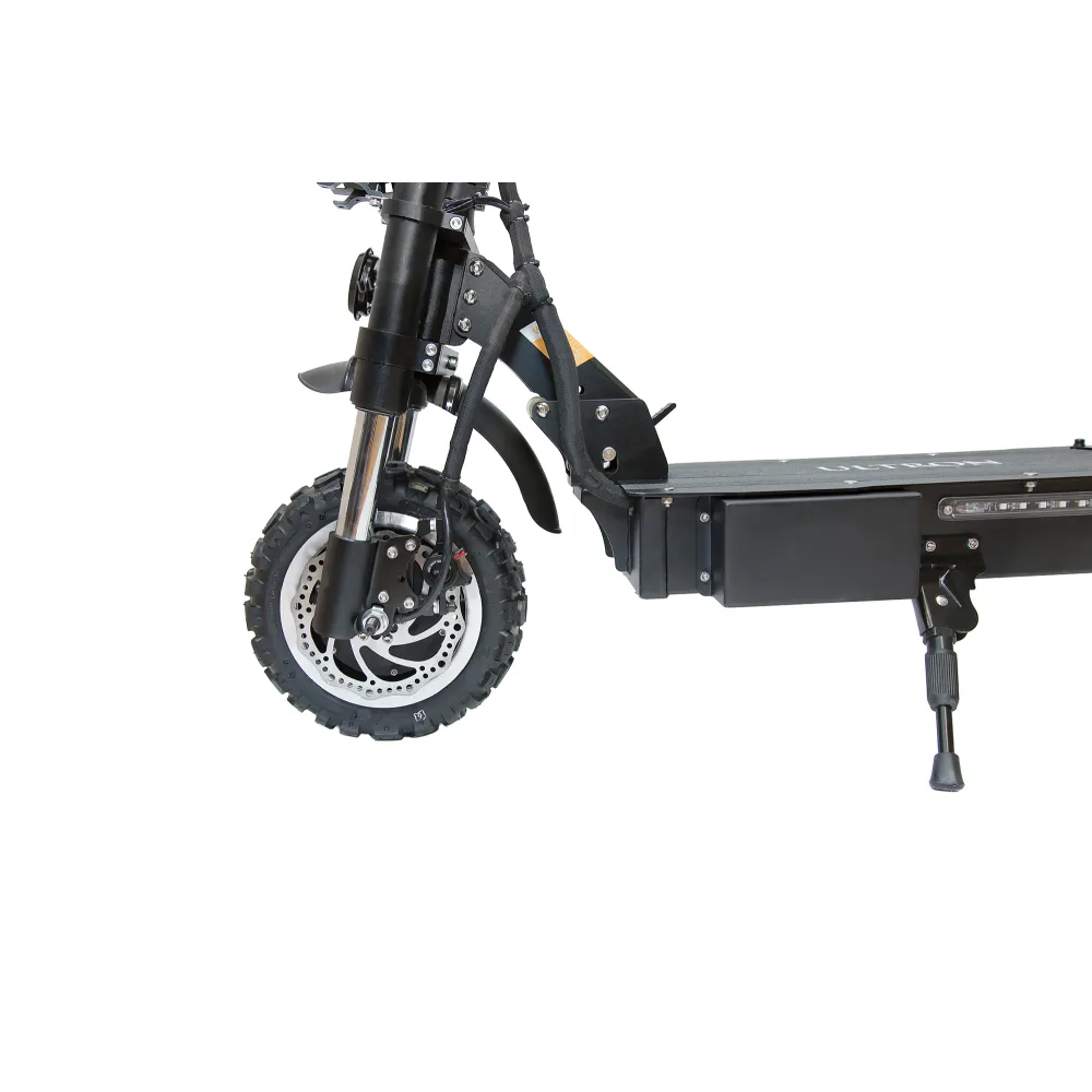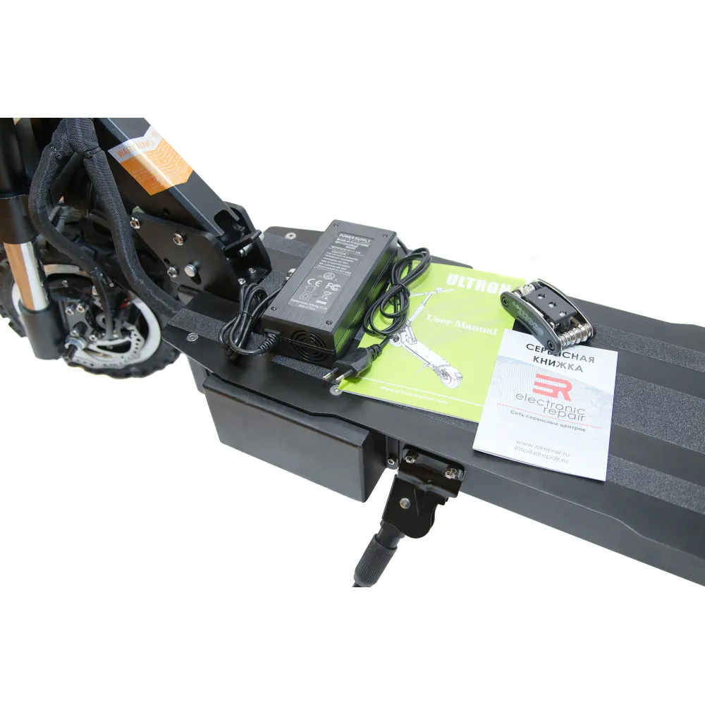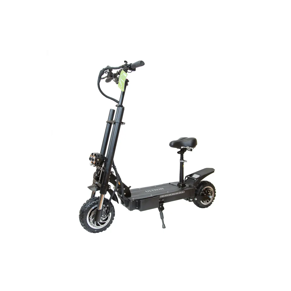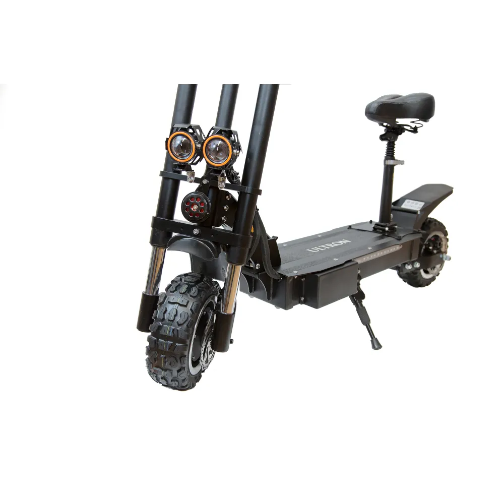 Электросамокат ULTRON T118 с усиленной рулевой стойкой, улучшенной амортизацией может преодолевать любые просторы. Для него не страшны подъемы и не ровная местность. Любители загородных поездок получили возможность передвигаться с комфортом на приличных скоростях. Движение в городе по асфальту доставит вам невероятные впечатления. Полный привод агрегата с мощностью двух двигателей 6000 Вт (по 3000 Вт каждый) позволяет развивать скорость транспорту до 85 км/ч. За счет прочной и надежной конструкции можно уверенно чувствовать себя за рулем такого устройства.
