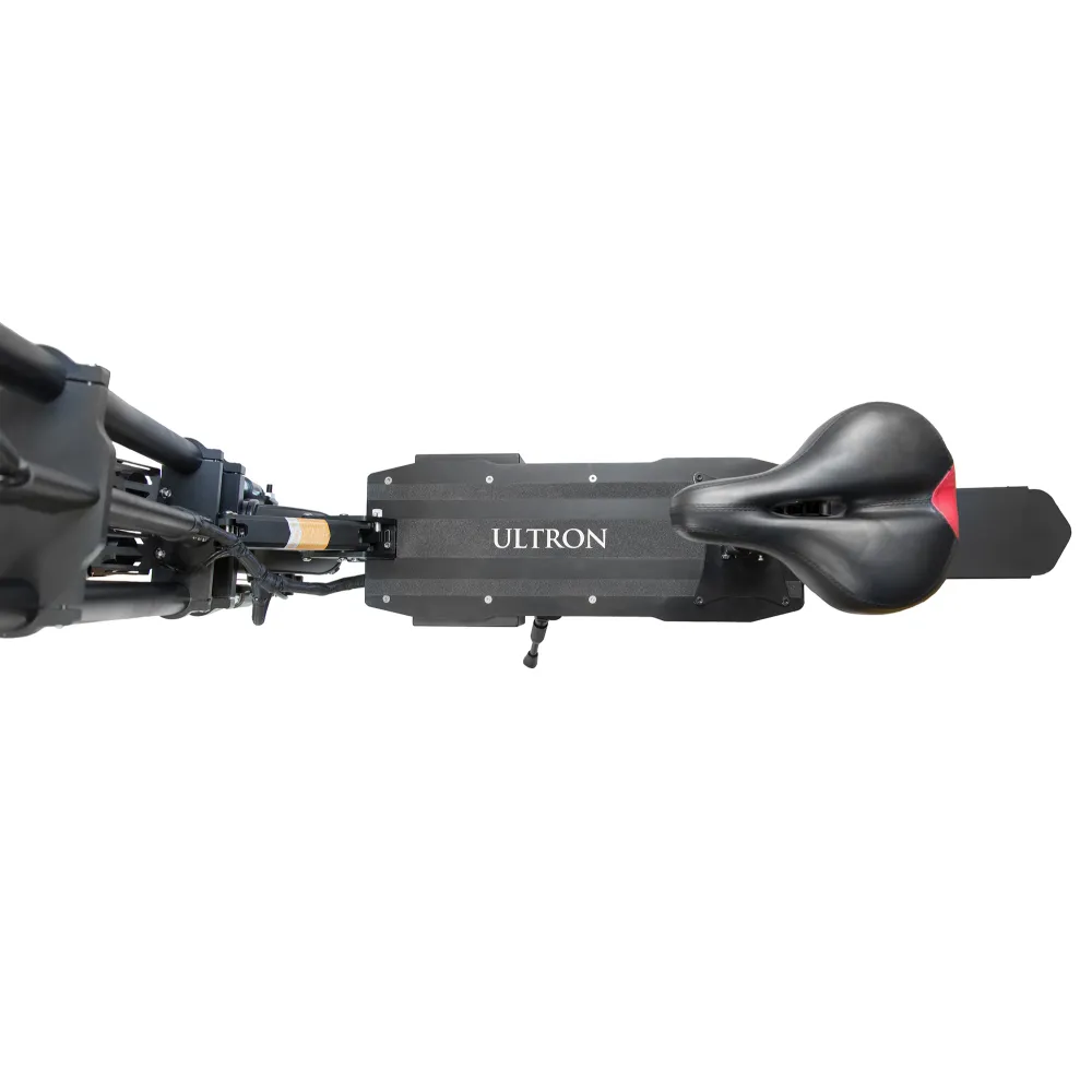 ULTRON T118 имеет 11 дюймовые широкие колеса, для большей устойчивости. Электросамокат оборудован съемным, амортизированным сидением. Оно понадобится в дальних поездках. Благодаря большой емкости аккумулятора 35 А*ч, транспорт может проехать на одном заряде до 95 км пути.