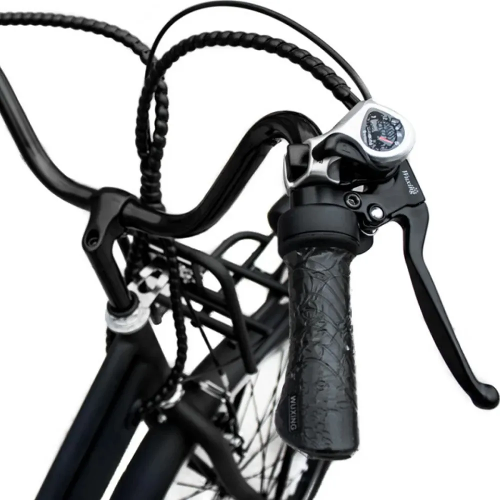 Электровелосипед Unimoto AIR, черного цвета – бюджетная версия, отлично подойдет для поездок на работу и неспешного отдыха за городом. Широкое классическое сидение и стандартные колеса 26 дюймов рассчитаны на свободное преодоление ям и кочек. Байк полностью универсален и прост – с управлением легко справятся и мужчины, и женщины.